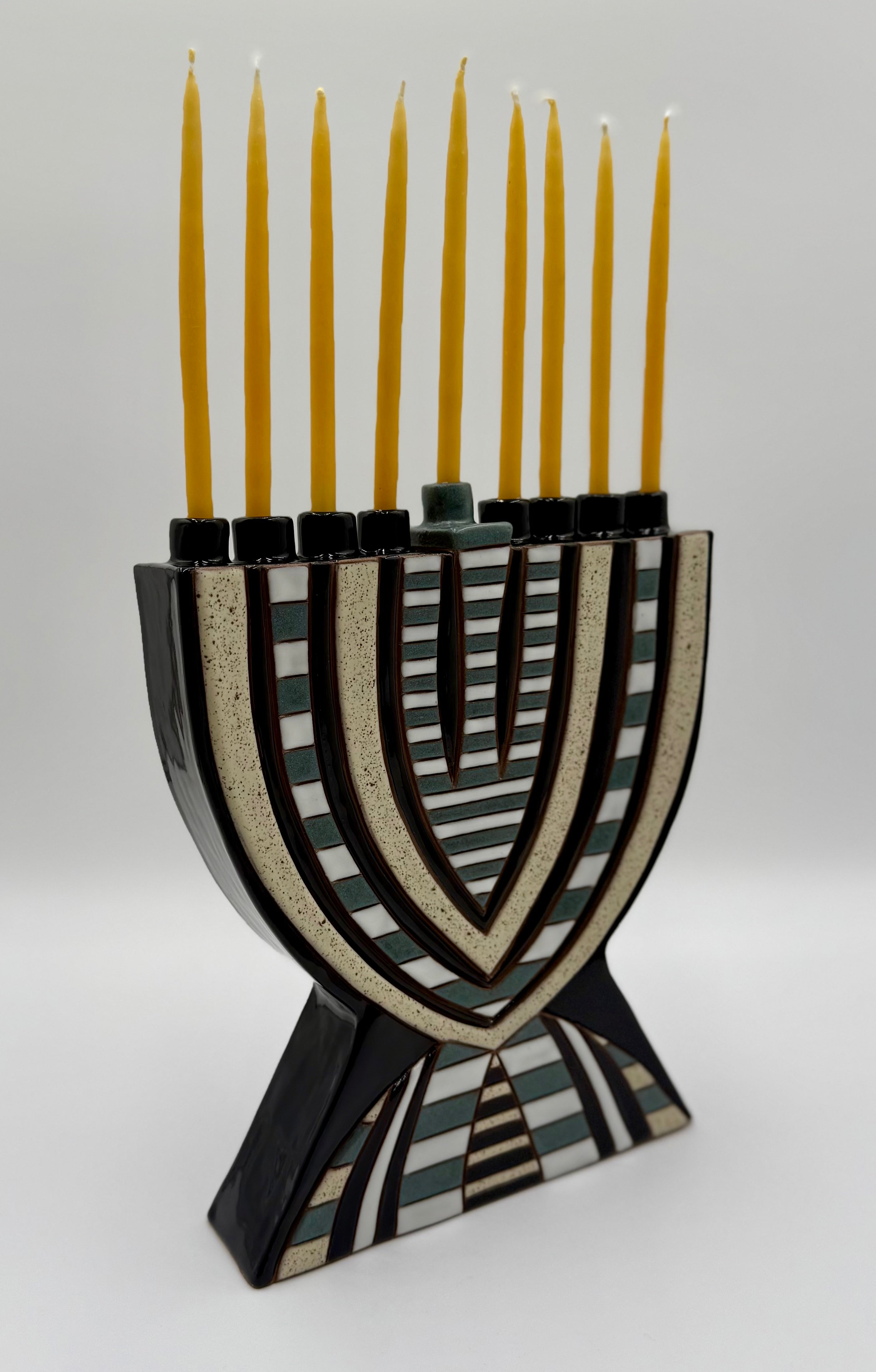 Hand built Clay Menorah, slab constructed from stoneware clay, carved, incised decoration and glazed by hand. Designed to be used and ENJOYED!!