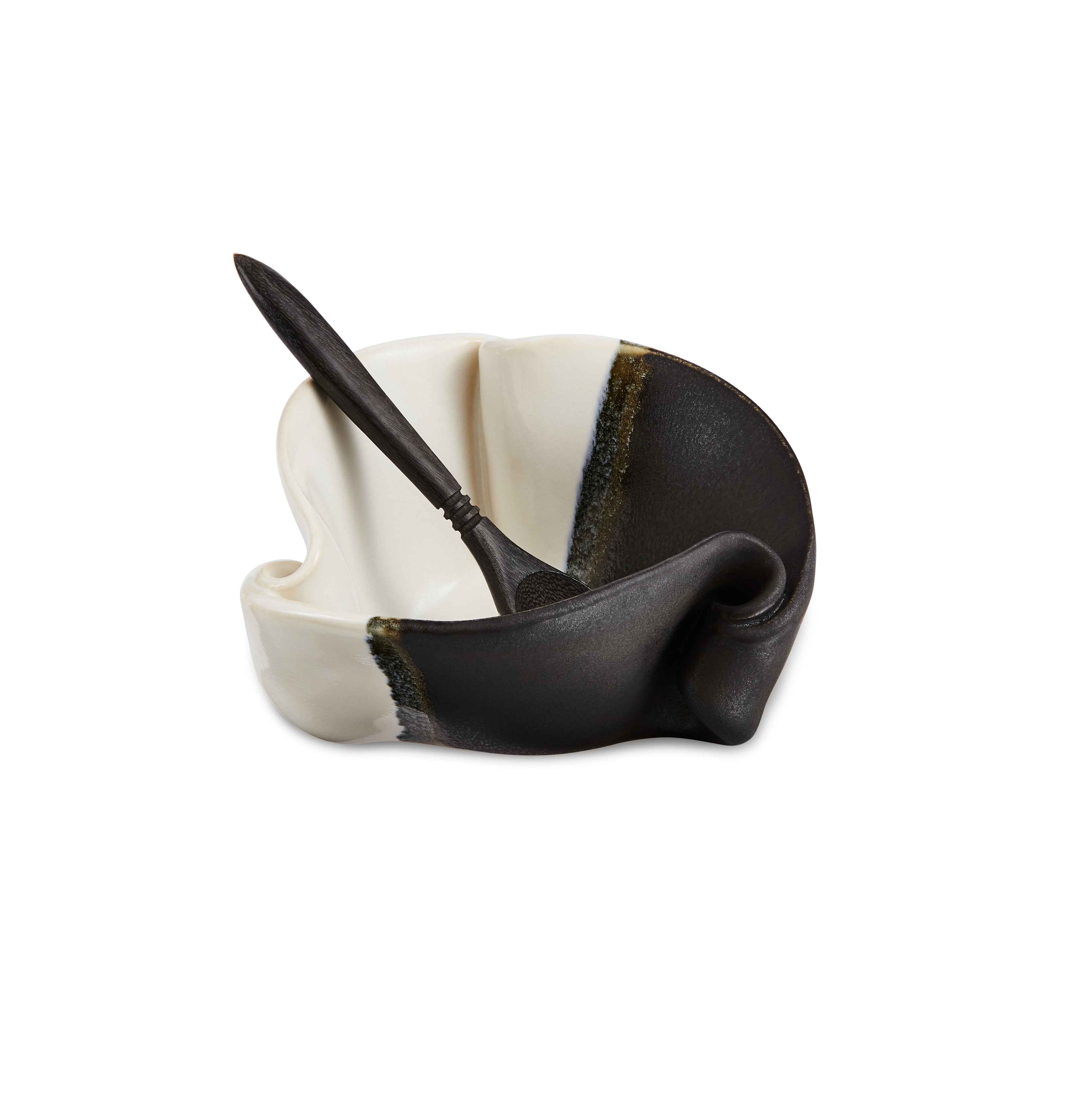 This politically correct pot is inclusive. It will accept all sauces, spreads and jams, not just mustard. The tiny rosewood spoon is sooo cute.