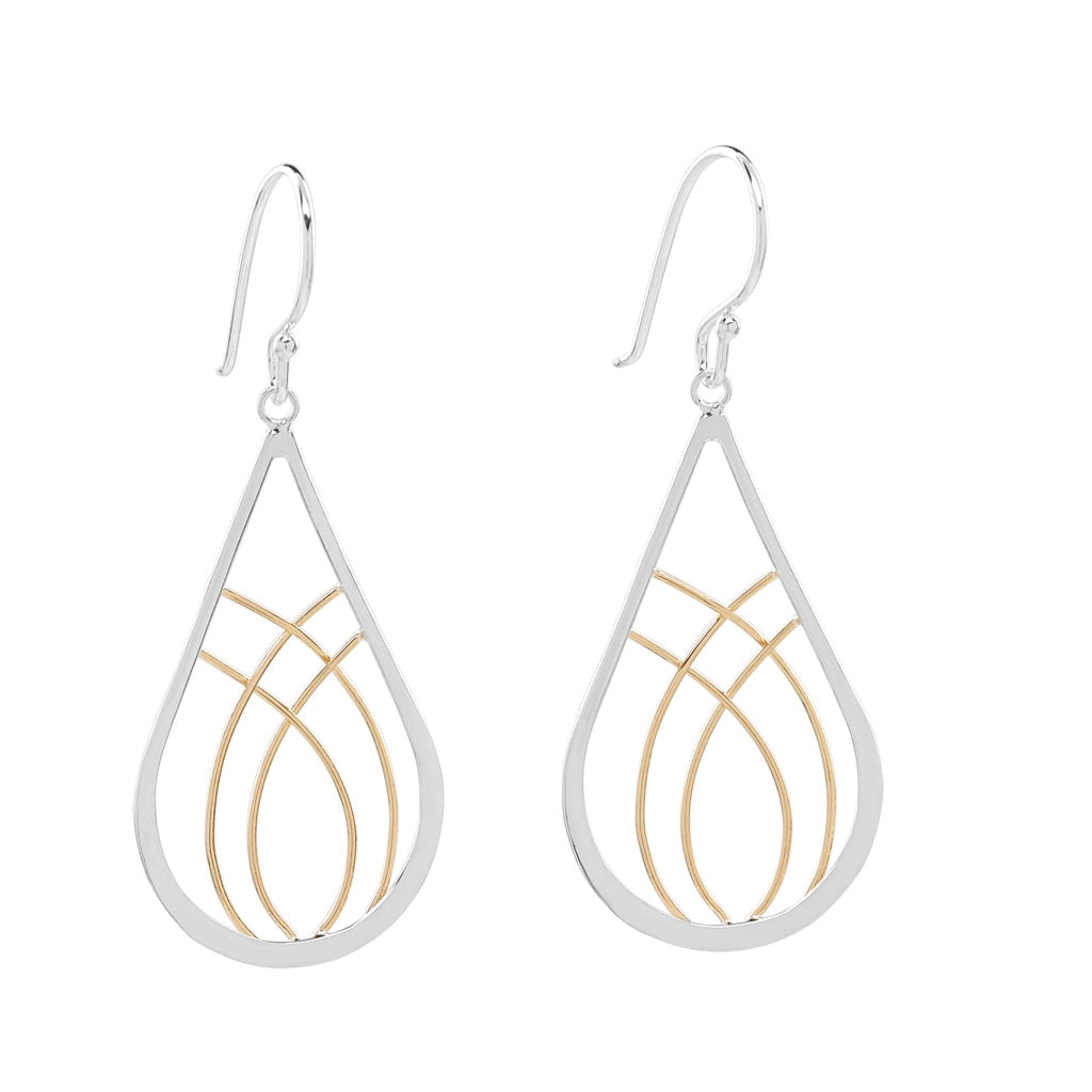 Tear shaped sterling silver with two strands of 14kt gold fill crisscrossing in the center.