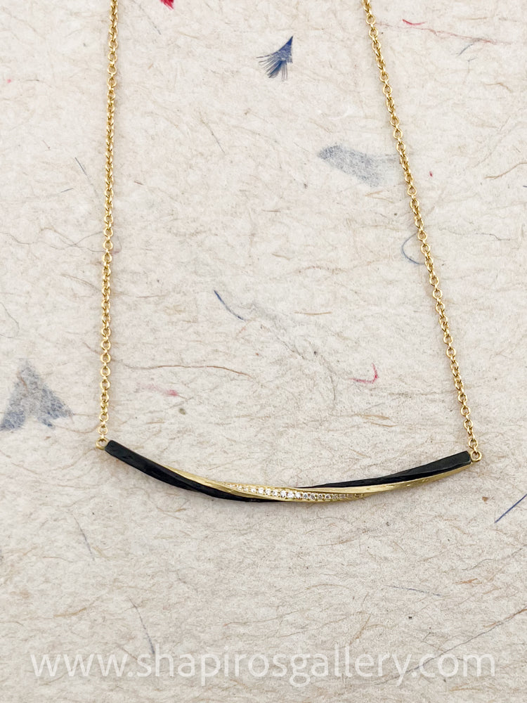 Eclipse Single Bar necklace two tone with .11 ct white diamonds on 1.5mm gold cable chain 18 K gold and oxidized cobalt chrome, 18" long