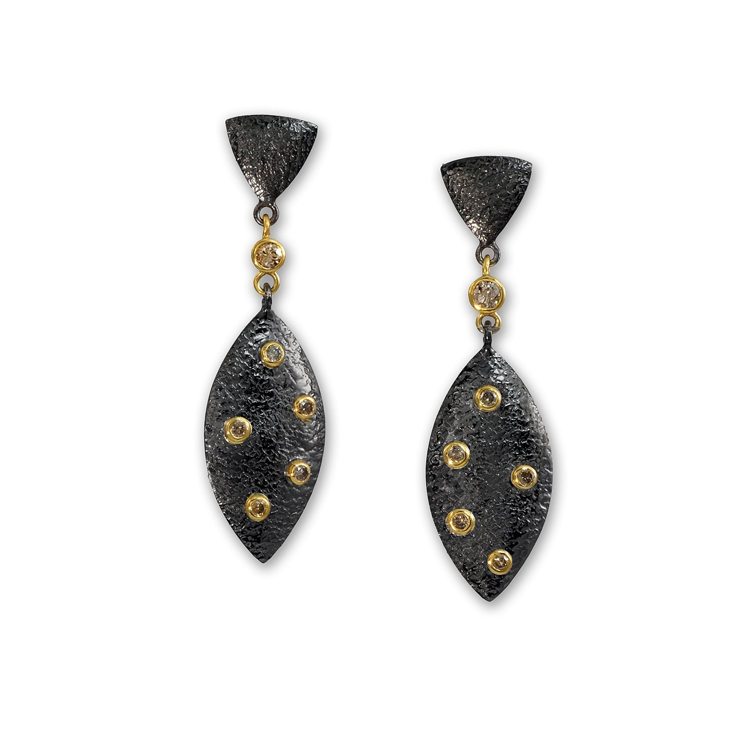 - Post earrings, finely crafted in black rhodium over sterling silver and 14k gold