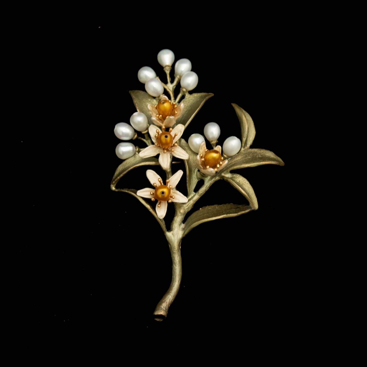 Cast bronze with a hand patina finish. Accented in matte white silver, 24k gold and freshwater pearls.