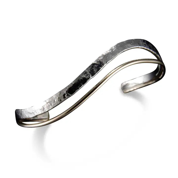14kt gold fill and hand hammered sterling silver. 2 1/2" wide.
