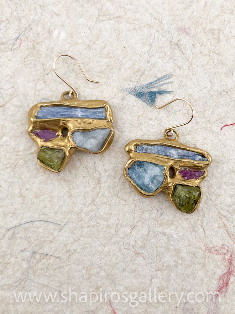 This collection was inspired by the unique ecosystems of the ocean and the significance of flora and fauna. Vastly different species rely on one another in order to thrive in their shared environment. Kyanite, aquamarine, ruby and grossular garnet come together in perfect harmony to create these earrings which dangle from handmade gold-filled ear wires. These earrings are surprisingly light for their size.