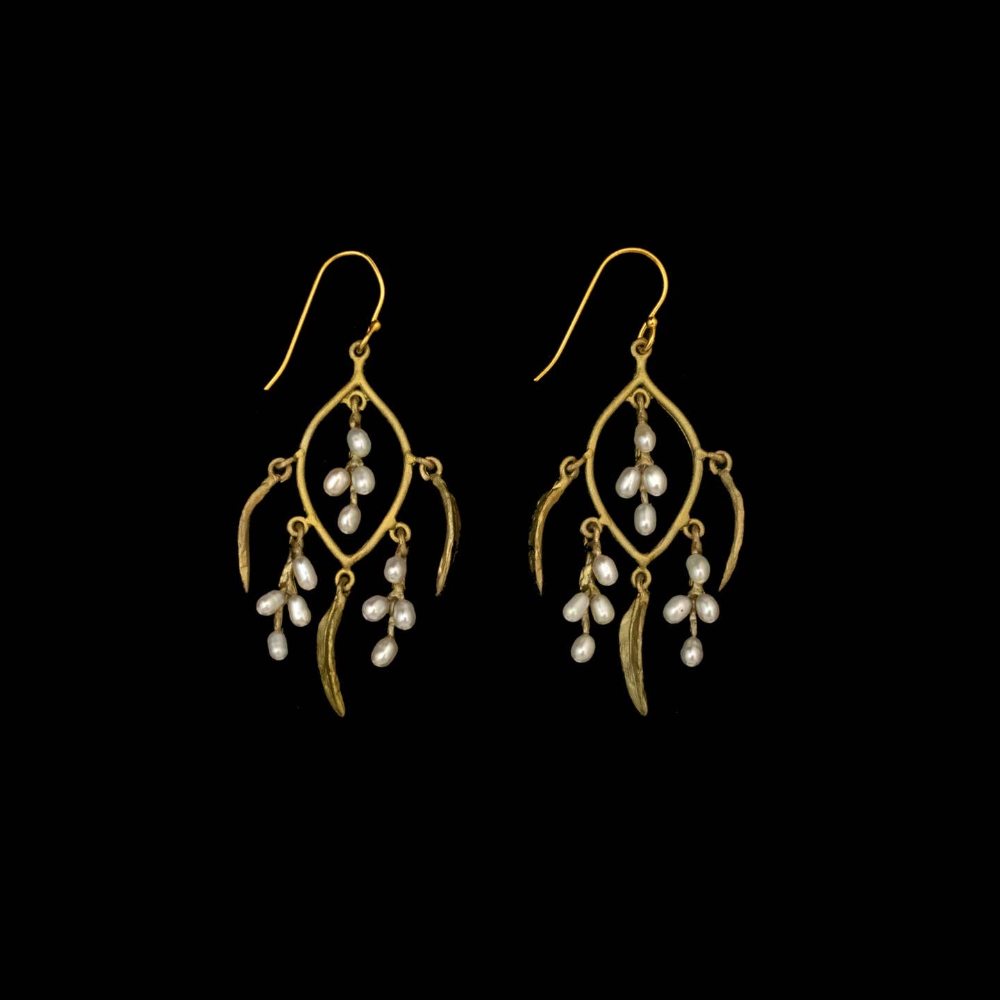 Cast bronze with a hand patina finish. Accented with white freshwater pearls.