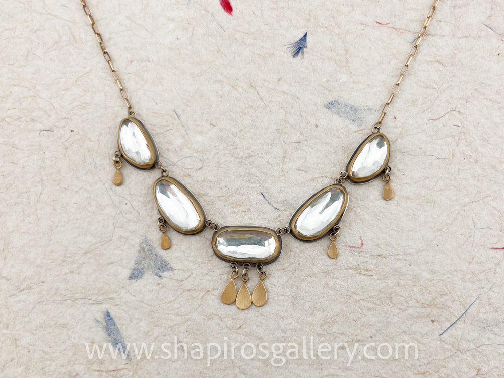 Five brilliant rose cut clear white topaz gems are wrapped in 22k gold and backed with sterling silver. A delicate fringe of 22k gold teardrops adds lovely movement. Gems are suspended from a textural 14k gold paperclip chain.