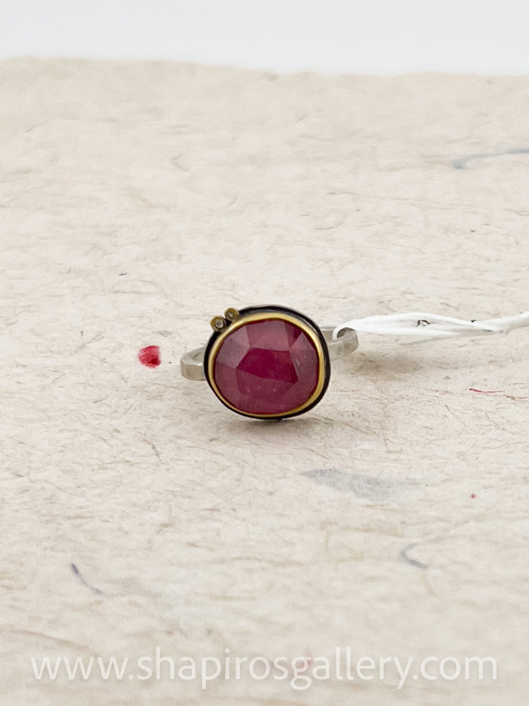 An incredible rose cut tourmaline in the juiciest pinks that fade ever so slightly from light to dark is wrapped in warm 22k gold and enhanced with two tiny, sparkling diamonds.