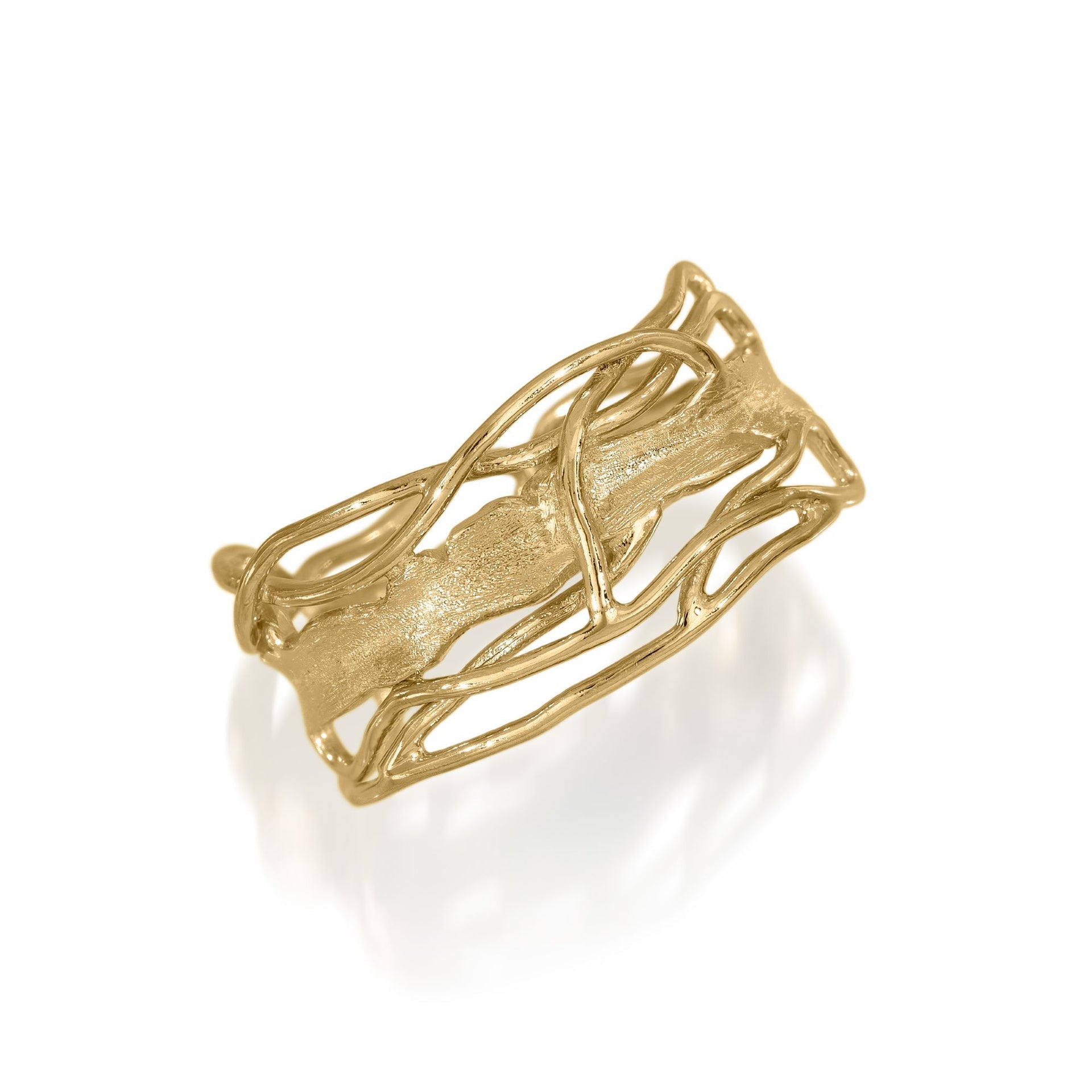 This 18k vermeil over sterling silver ring is the slim version of the Edge Ring. The Slim Edge Ring combines a central brushed band with fluid organic lines, creating a sculptural and intricate piece. Its contemporary, artistic style makes a bold statement, embracing the beauty in imperfection.