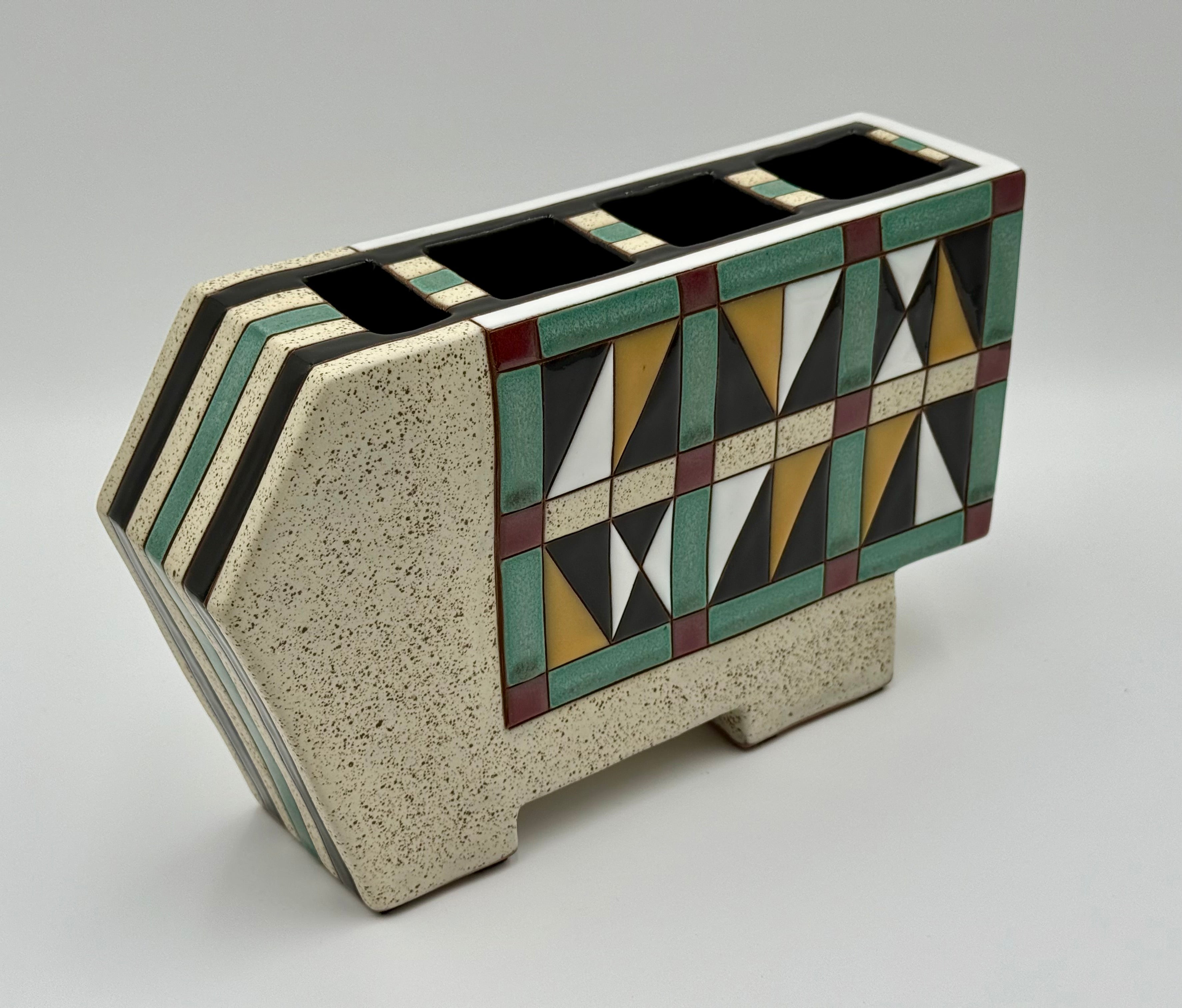 Her forms are decorated with geometric patterns inspired by Art Deco Design, Native American Art and Art of Ancient Cultures.