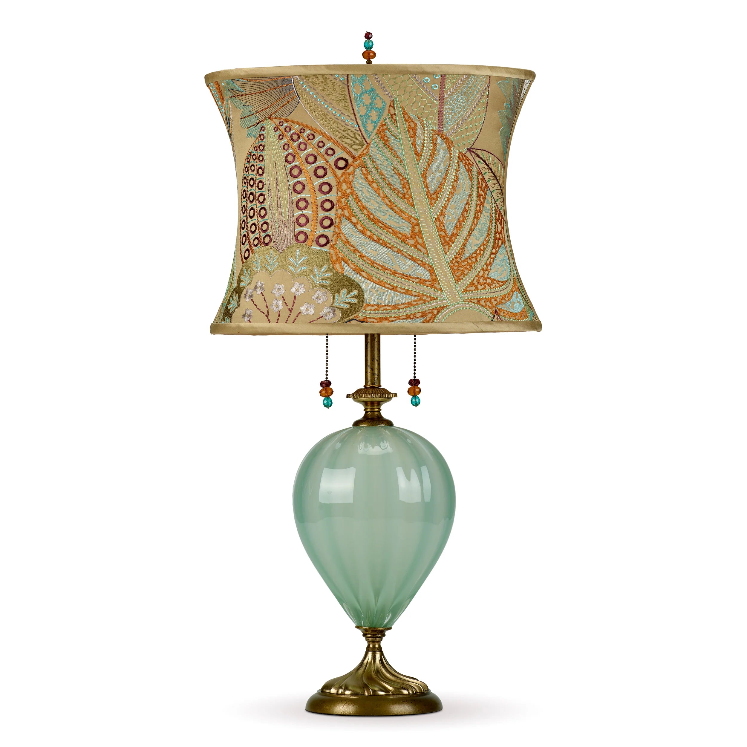 Elaura is a stately lamp with sea foam blown glass matched with a corset drum shade covered with silk fabric with an abstract botanical design. The colors in the shade include sea foam, copper, purple, gold and blue. Elaura has a double bulb socket and is finished with beaded pulls and a beaded finial.
