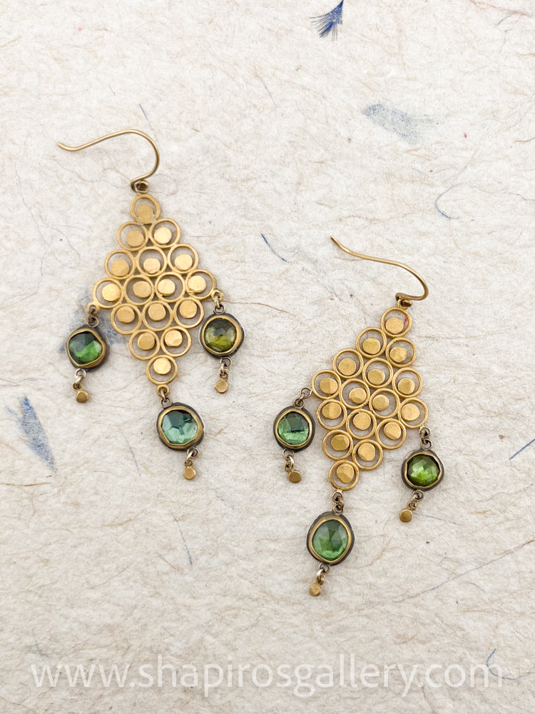 Celebrate a special occasion or revel in the beauty every day with these 18k gold filigree earrings, accented with rose cut green tourmaline and 22k gold dots. Tourmaline stones are bezel set in 22k gold, with sterling silver backing and 18k earwires.
