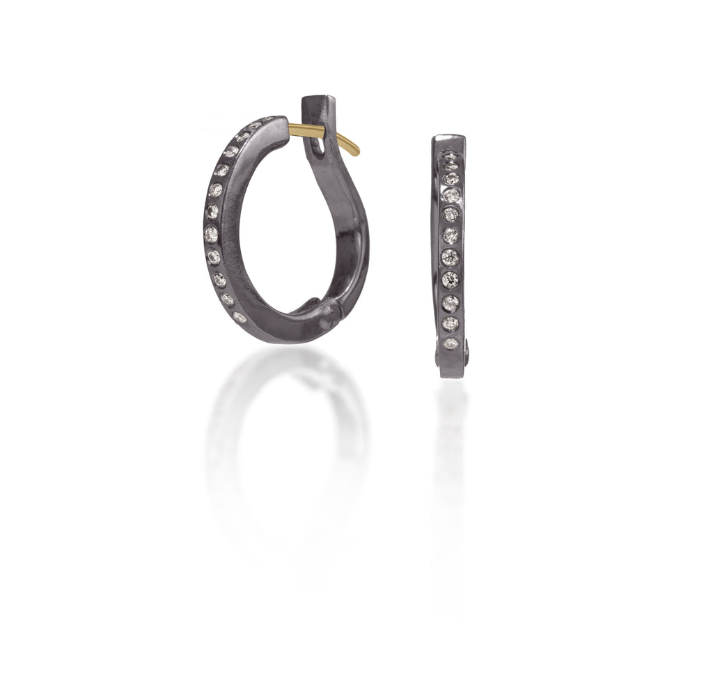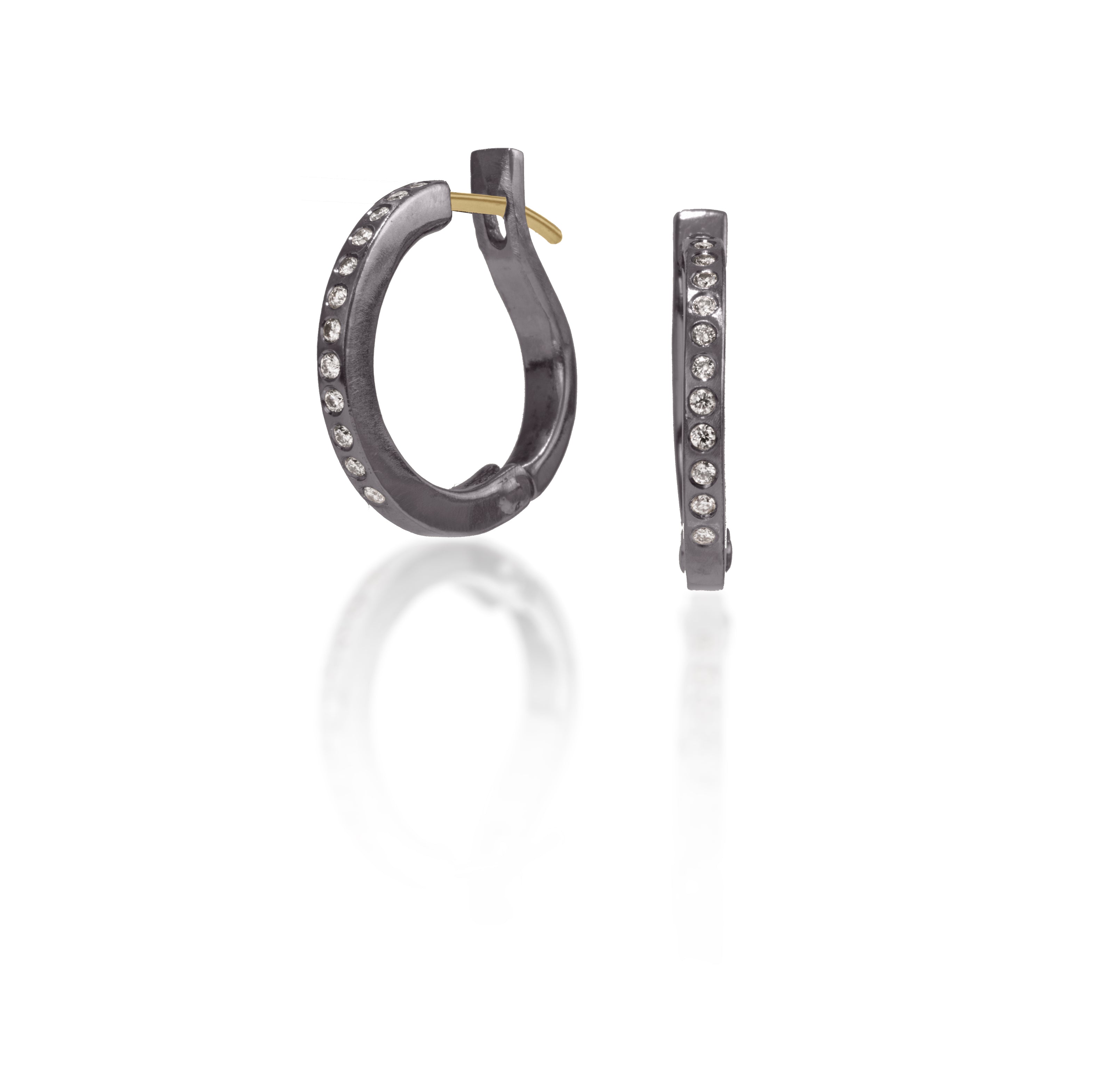 These simple, but elegant hoops are great on their own or accented with gem as a drop earring. They feature white diamonds, 0.1656 tcw., and a built in closure that snaps securely closed.