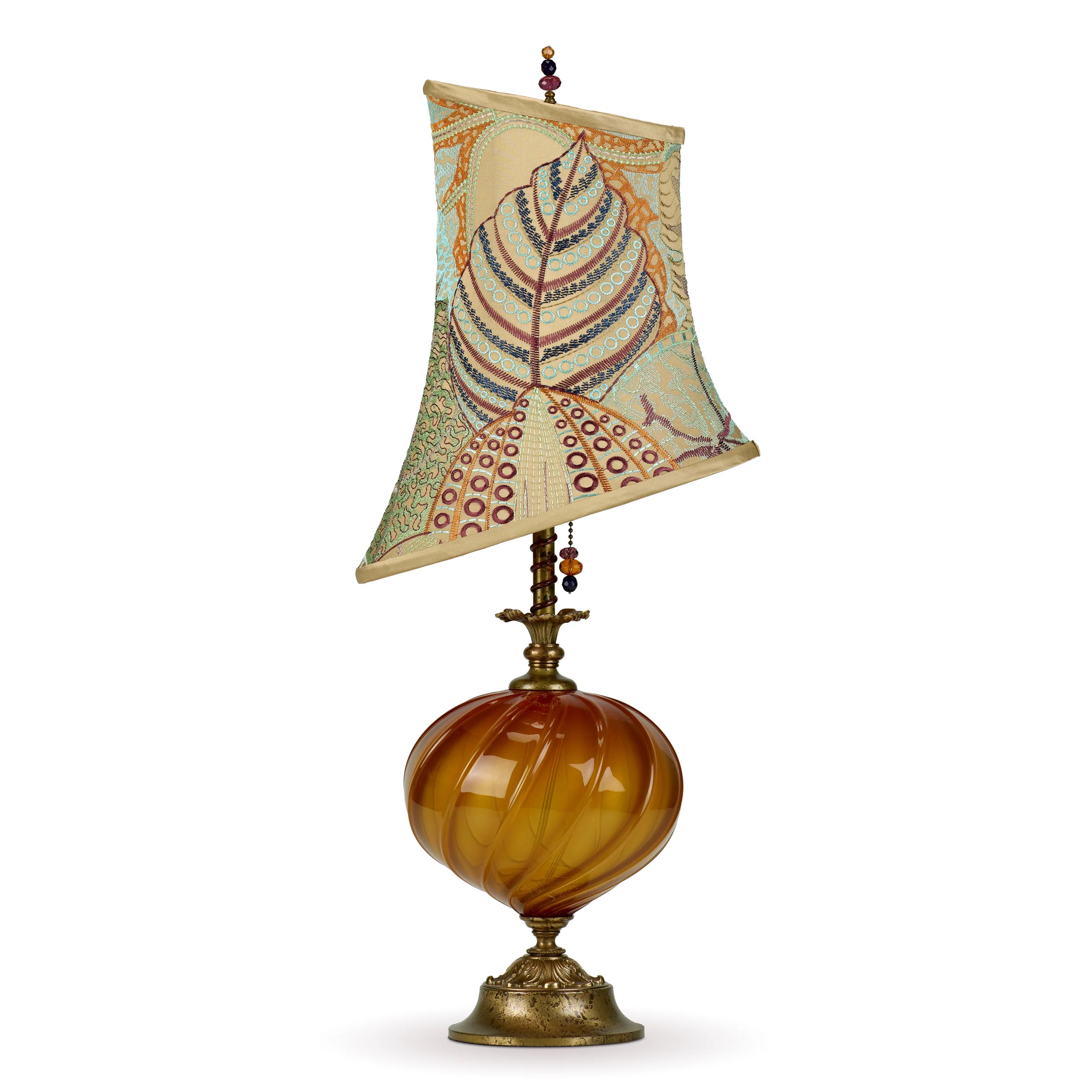 Isla (copper) is a charming lamp with copper blown glass matched with an asymmetric shade covered with silk fabric with an abstract botanical design. The colors in the shade include sea foam, copper, purple, gold and blue. Isla has a single bulb socket and is finished with a beaded finial.
