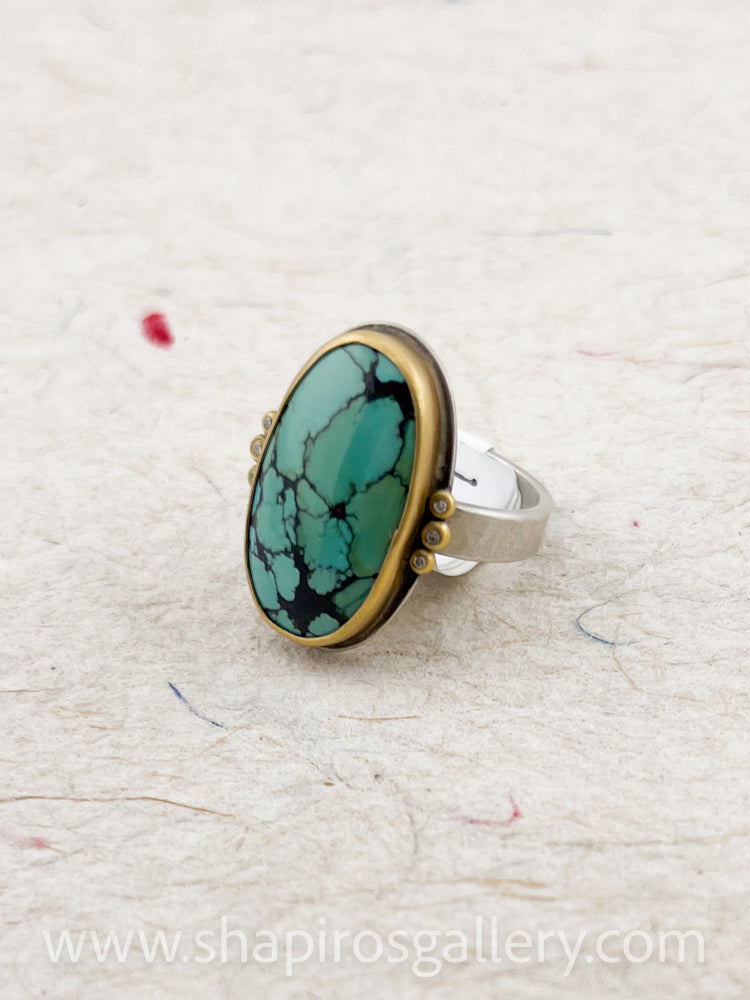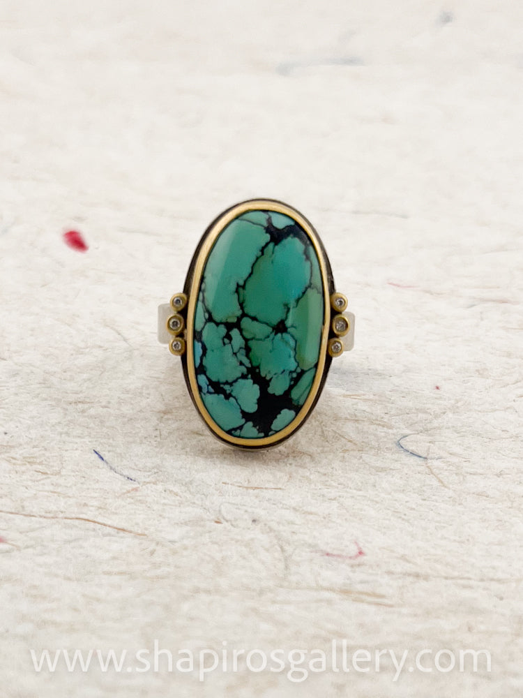 This stunning Green Turquoise is wrapped in contrasting, warm 22k gold and set on a simple hammered band accented with 6 sparkling diamonds.