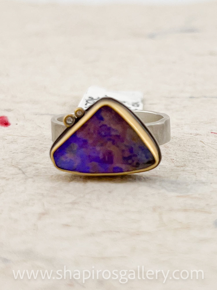 A magical, one of a kind Purple Boulder opal is wrapped in warm 22k gold and accented by a pair of sparkling white diamonds. Sterling silver back and a hammered band. A truly special and powerful ring, dancing with color and light.