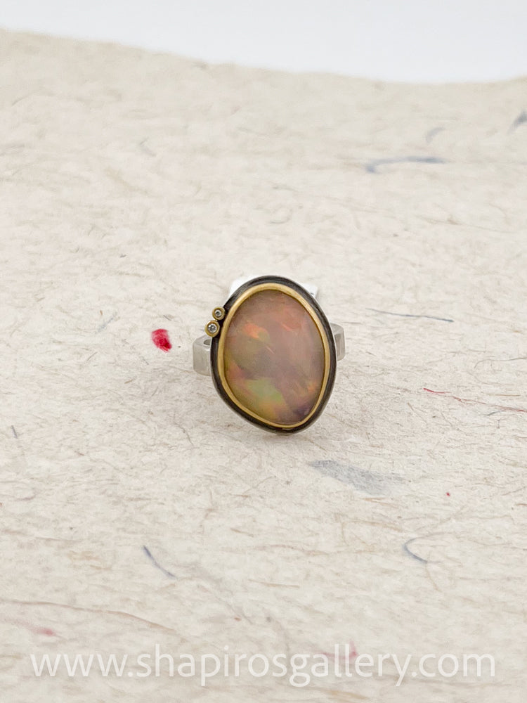A magical rose cut Ethiopian opal is wrapped in warm 22k gold and accented with a pair of tiny sparkling white diamonds. Sterling silver back and hammered band. A truly special ring, dancing with light.