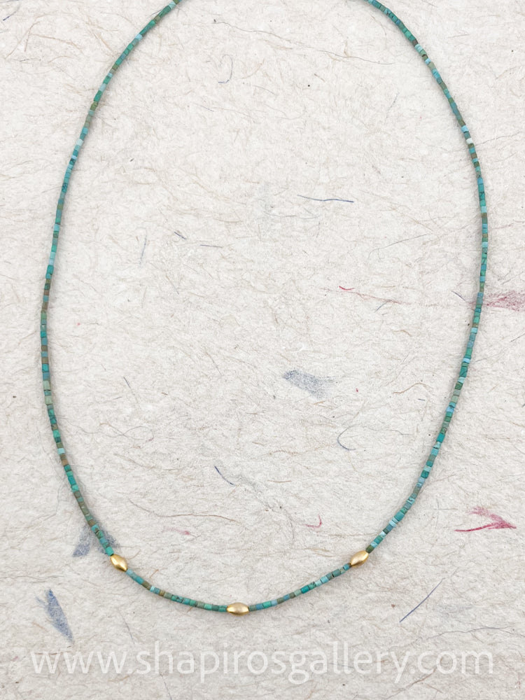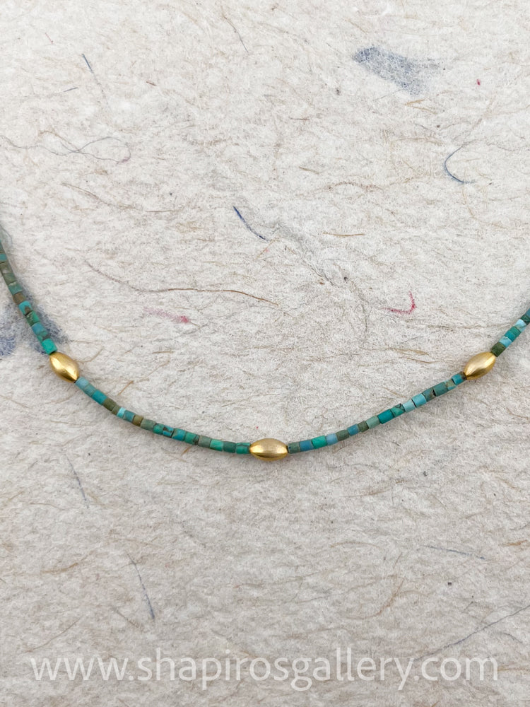 Three warm 20k gold rice shaped beads shimmer on a delicate strand of tiny, vibrant green turquoise beads. Lovely to layer with other necklaces, or wear on it's own!