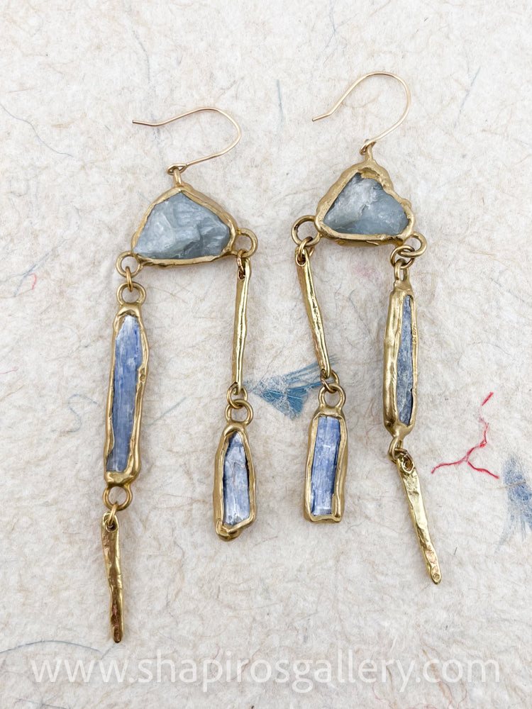This collection was inspired by the push and pull of rapids before the calm of still water. These earrings are created with ocean blue kyanite & aquamarine set in brass and dangle from handmade gold-filled earring wires.